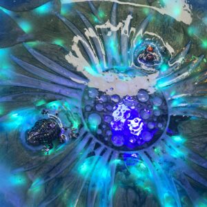 $125.00A one-of-a-kind illuminated sculpture where nature meets neon. This two-part resin casting features a jewel encrusted amphibian and Bombus bifarius within a swirling, cyber-floral pool. Powered by a standard wall plug.