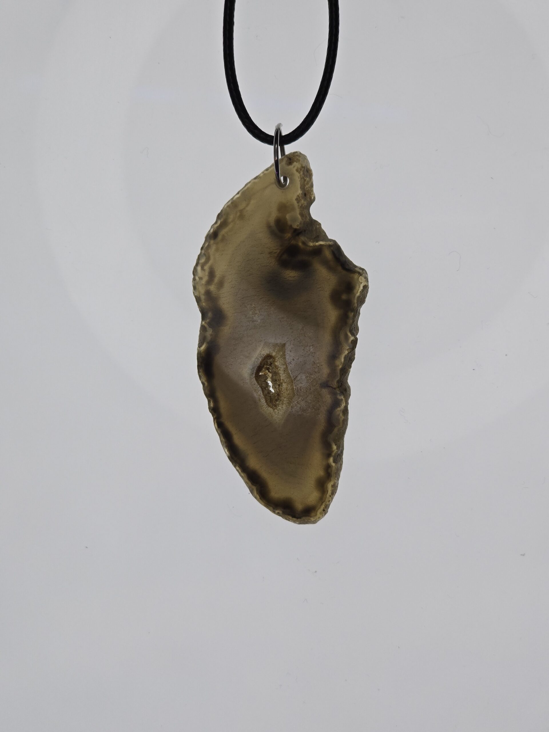 A singular geological specimen. Features a raw, crystallized druzy center (‘The Eye’) surrounded by deep smoke-grey banding and a rugged edge.