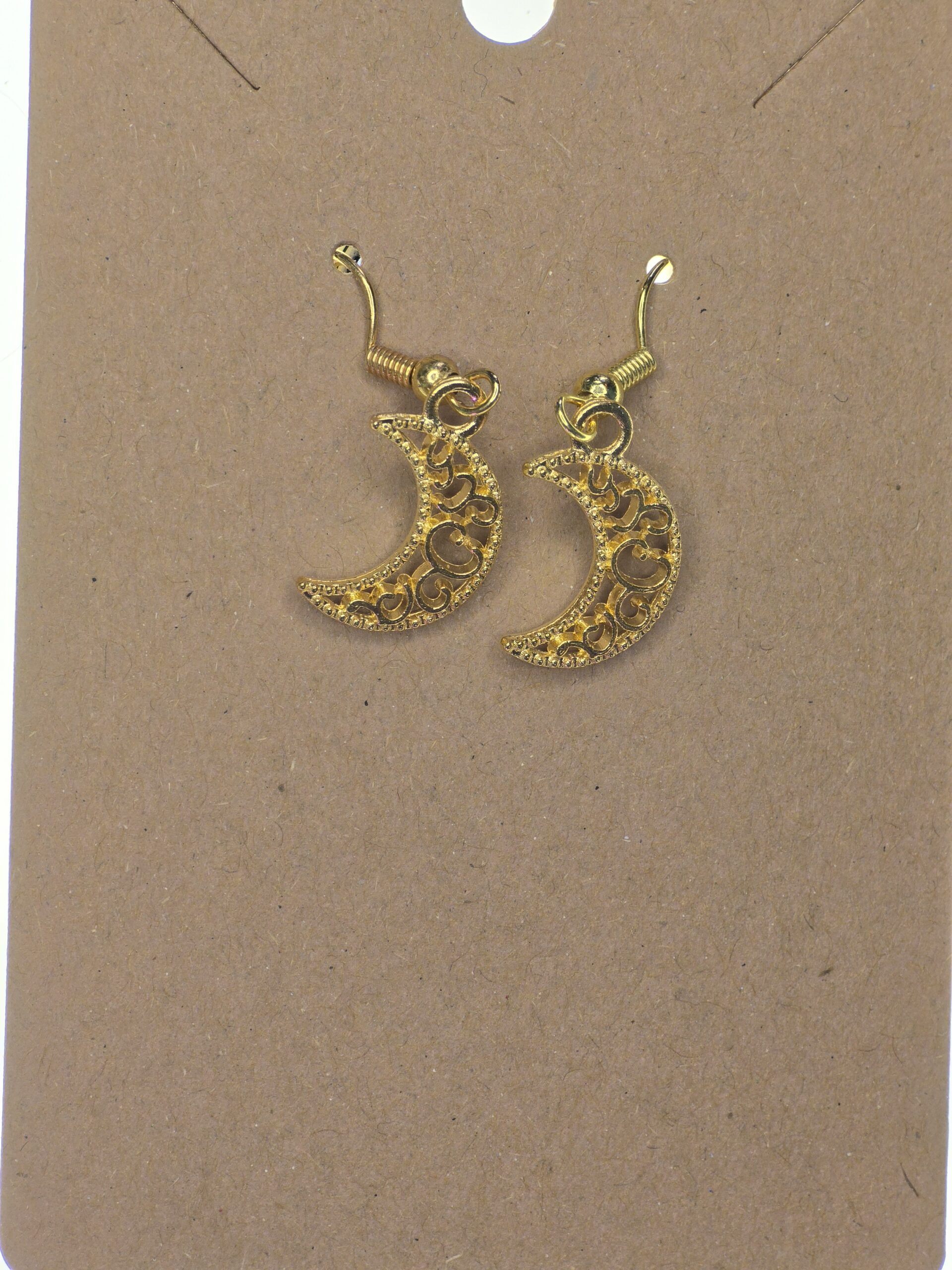 Gold-tone crescent moon featuring an intricate internal scrollwork/lace pattern.