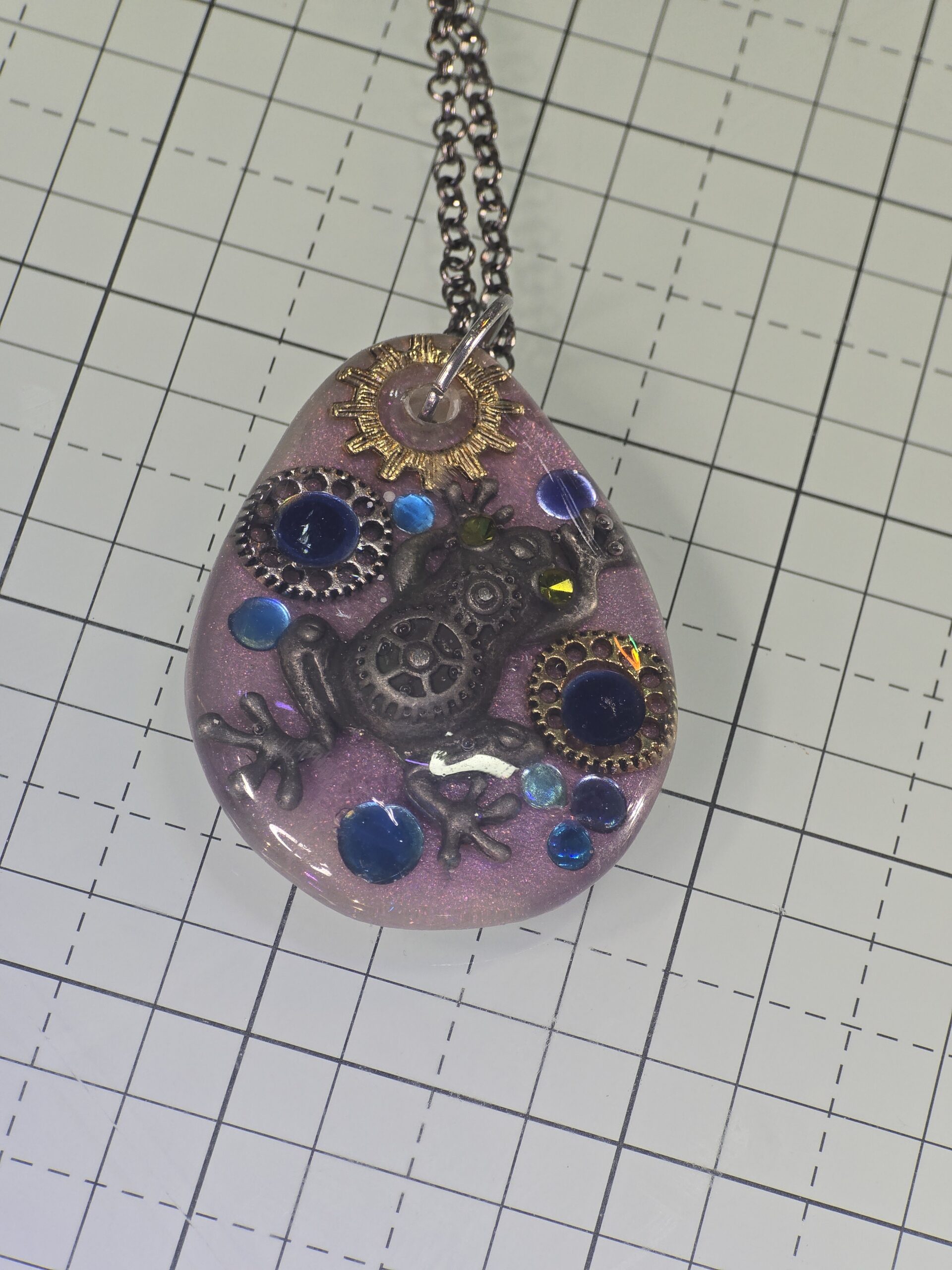 A whimsical mixed-media pendant featuring a metallic frog and gear charms set in shimmering orchid-purple resin. Accented with blue rhinestones. A fusion of biology and machinery.