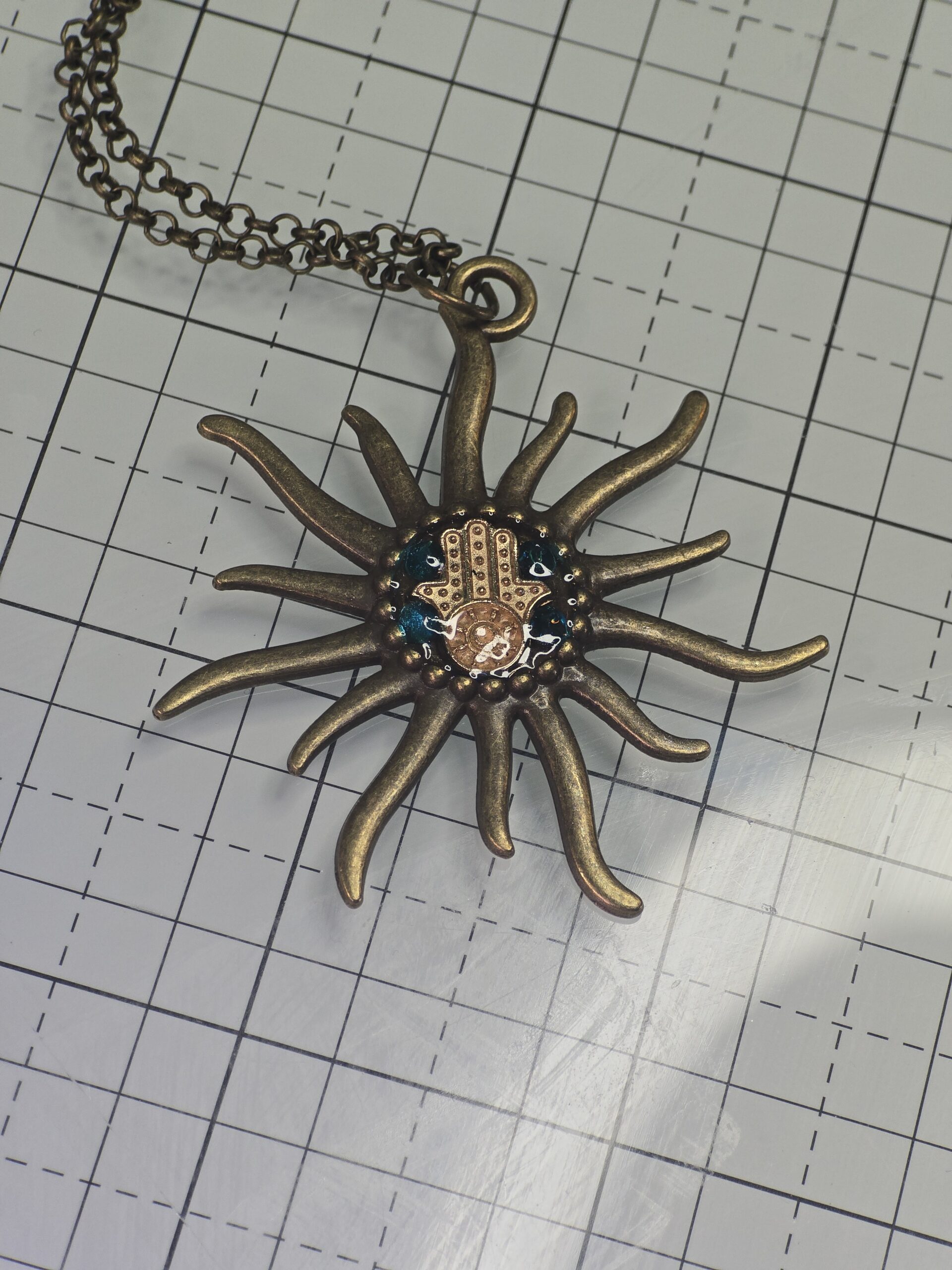 An antique bronze sunburst pendant centered with a protective Hamsa hand against a deep teal background. Protection for the modern traveler.