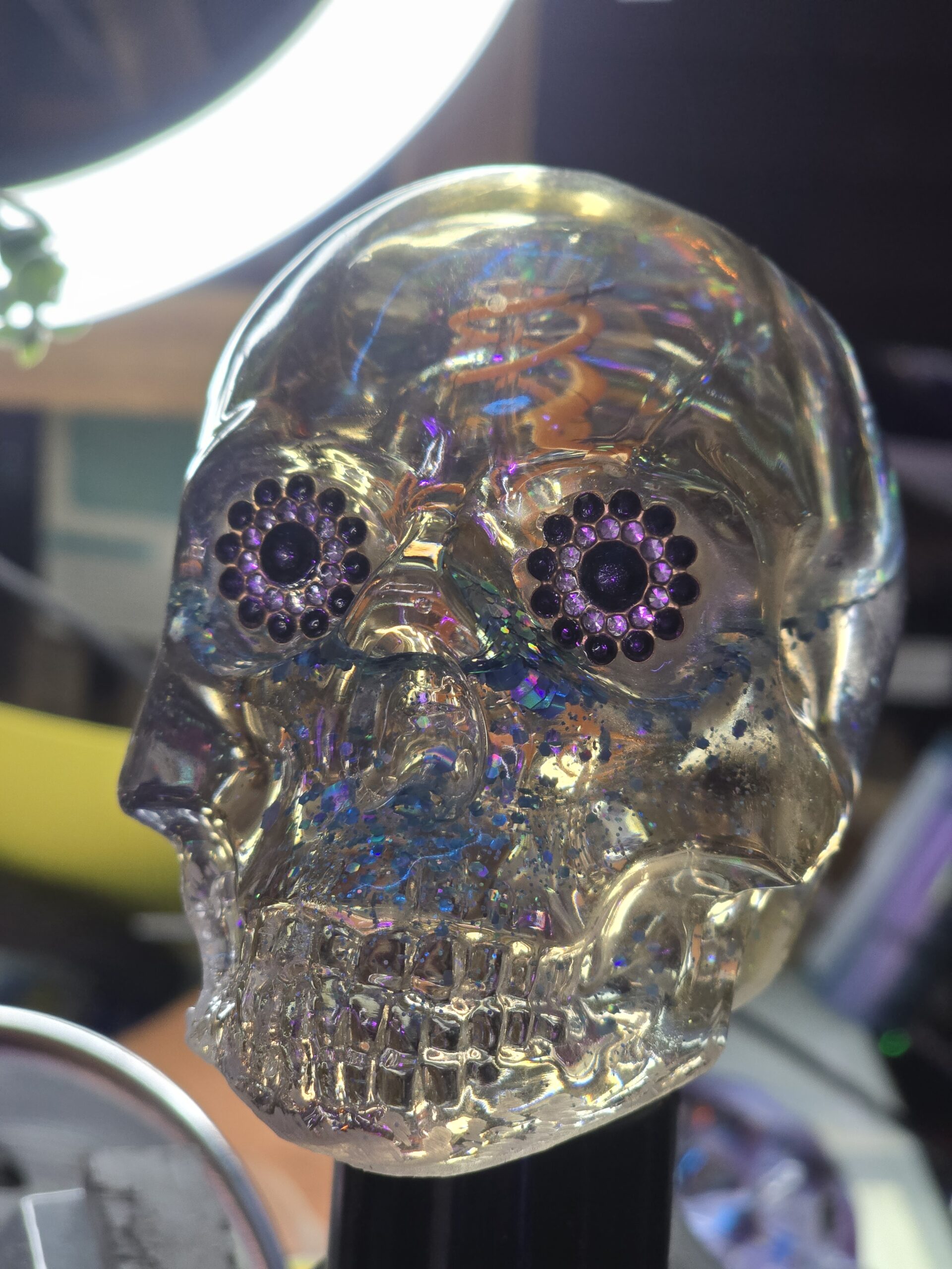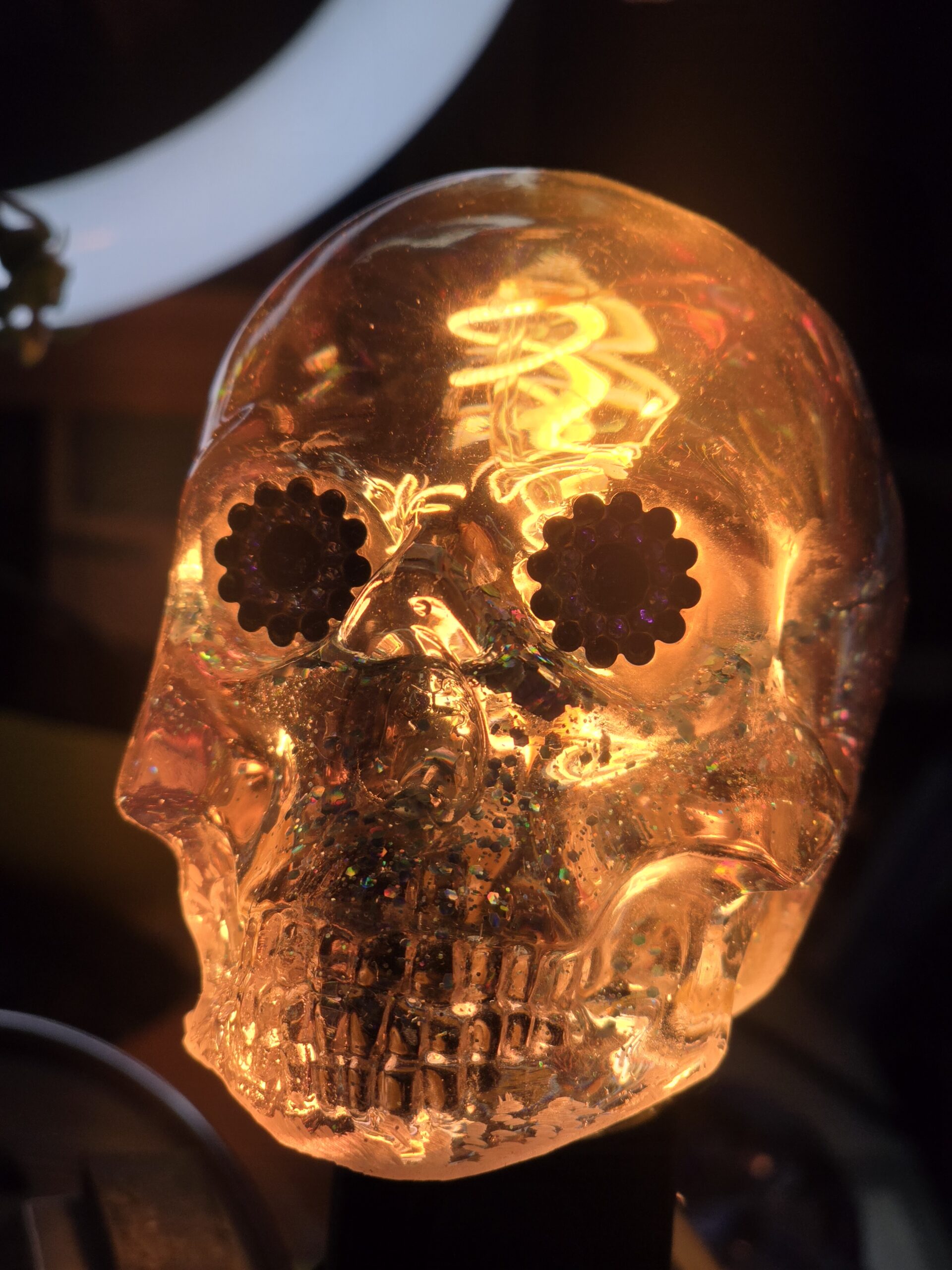 A custom decorative skull bulb featuring embedded glitter and striking rhinestone eyes. Glows with a warm, amber artisan light. A true conversation piece.