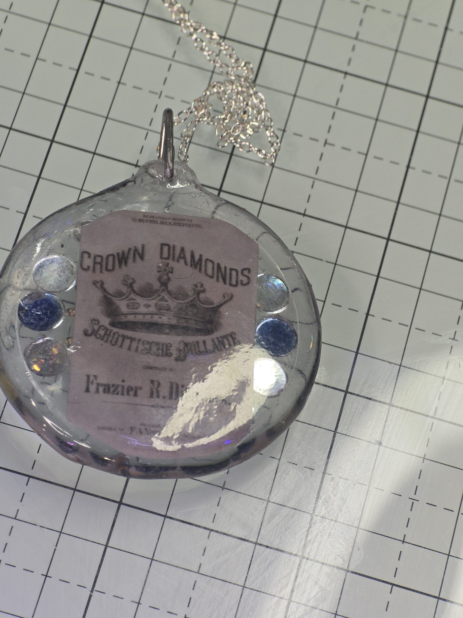 A double-sided vintage style resin pendant. Side A features a “Crown Diamonds” archival print. Side B reveals a geometric cluster of royal blue gems. Suspended on a silver chain.